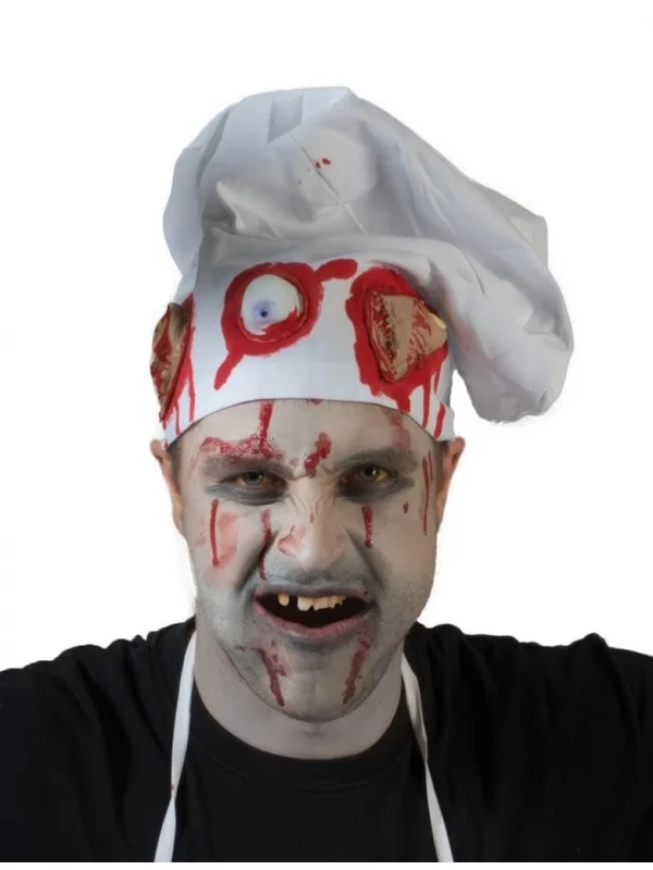 La toque est ensanglantée sur laquelle l’on a fixé des restes humain pour plus d’horreur et de terreur. Soignez votre maquillage de chef cuisinier tueur et portez un tablier également ensanglanté. Avec ça vous sortirez du lot et des déguisements de halloween habituels.
