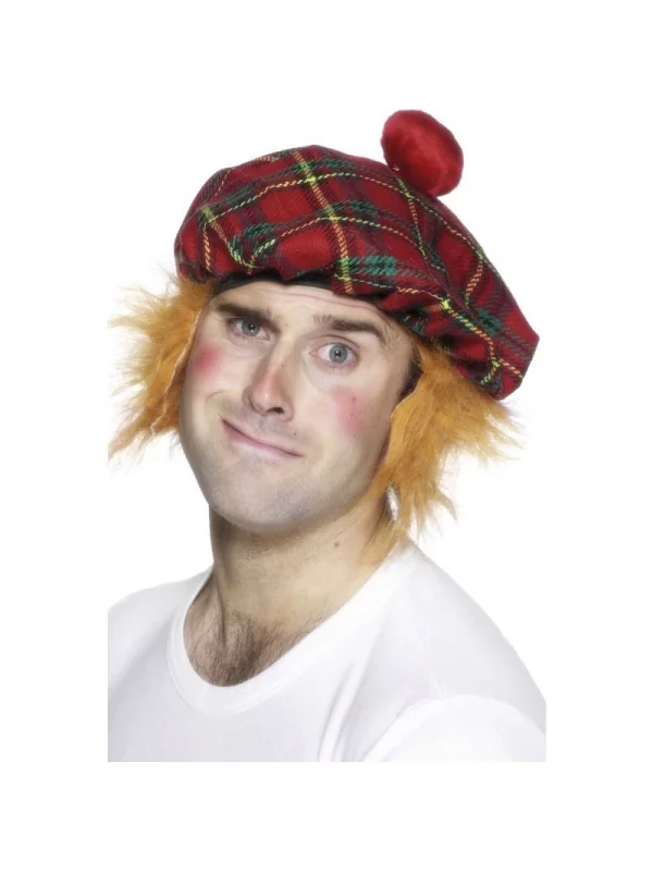 En effet, voici le béret écossais + cheveux pour devenir un vrai Écossais durant la fête. L’accessoire est fait avec un tissu à motifs à carreau et il est doté de faux cheveux courts.