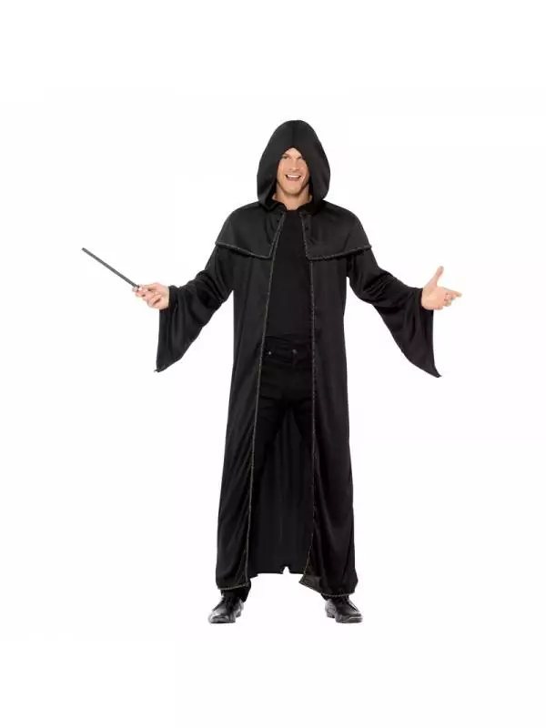 Sous cette grande tenue à cape noire et capuchon, agrémentée de bordures dorées, vous allez vous donner le look d’un magicien intemporel de style élégant et mystérieux à la fois. Offrez-vous l’apparence et la prestance d’un personnage de contes modernes, ou l’authenticité d’un sorcier médiéval. Vous pouvez être un sorcier blanc bienfaiteur ou un magicien du côté obscur.