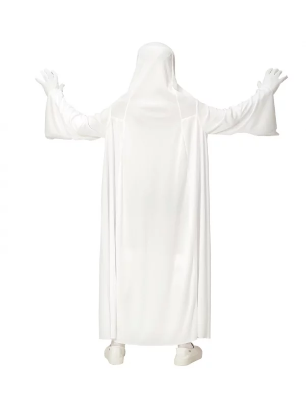 La tunique, globalement très simple, est l’unique pièce qui compose le déguisement. La tunique est dotée de manches longues et larges. Elle recouvre l’enfant de la tête aux pieds, dans un tissu respirant, doux, léger d’un blanc immaculé. Seuls le contour des orifices pour les yeux, ainsi que l’esquisse du large sourire faussement maléfique, sont dessinés en noir.