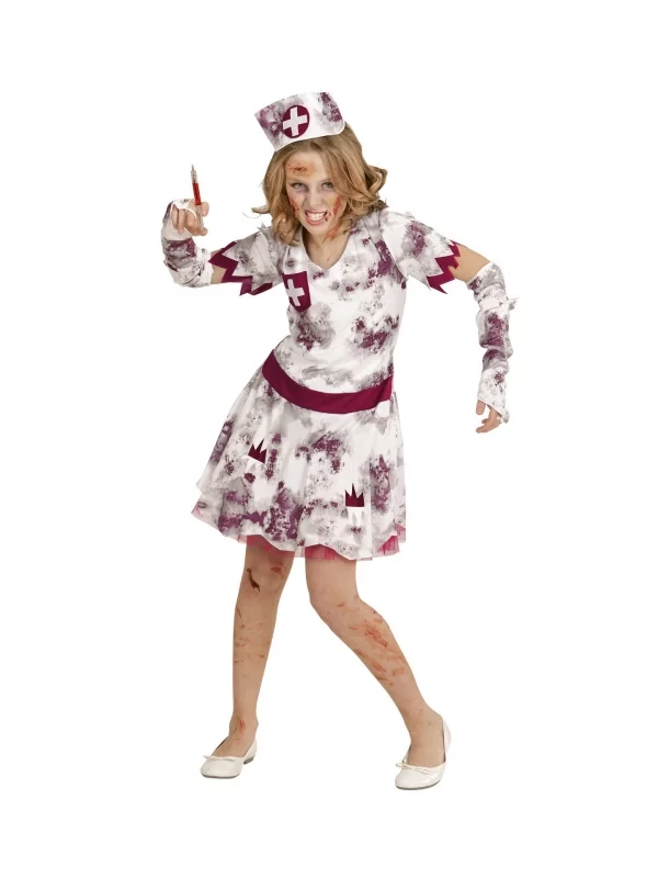 La robe blanche d’infirmière accompagnée de la coiffe et des mitaines ensanglantées est tachée de sang défraîchi, d’emblée pour inspirer l’horreur à tout son entourage. Vous n’avez plus qu’à mettre le maquillage macabre à votre fillette ou ado, pour qu’elle donne la vision violente d’un esprit frappeur en chair et en os putréfiés ! Ce costume de morte-vivante pour ados et fillettes contribuera à créer l’ambiance glauque et sinistre qui manque à vos événements Halloween et autres.