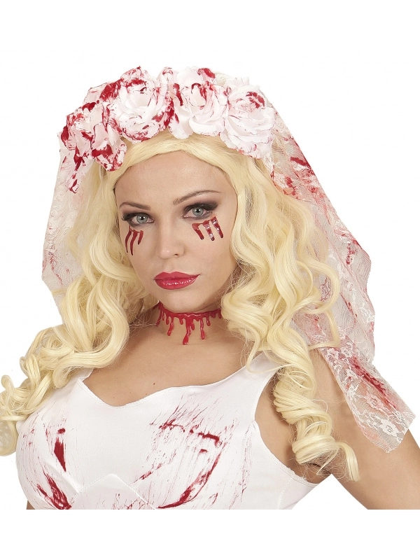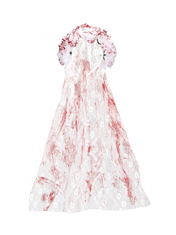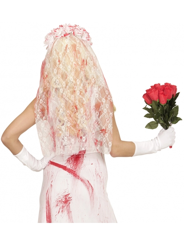 Si vous êtes à la recherche d’un accessoire original, vous serez certainement séduite par ce voile de mariée avec ses roses blanches, le tout ensanglanté.